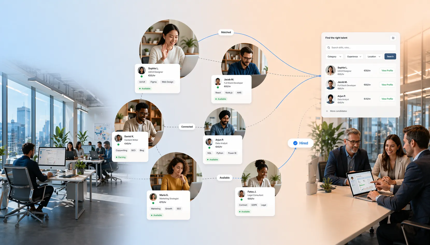 Discover top talent from a diverse pool of skilled professionals. Whether you need a tech specialist, creative designer, or legal advisor, our platform connects you to the right expertise. Leverage our smart search tools to streamline your hiring process and make informed decisions quickly.